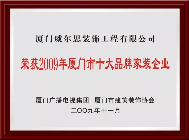 2009年在管理上威爾思裝飾引進(jìn)ISO:9002國(guó)際質(zhì)量管理體系,促使公司管理與國(guó)際同步,走上正規(guī)化,同時(shí)榮獲“廈門市315信譽(yù)單位”“廈門十大品牌家裝企業(yè)”;