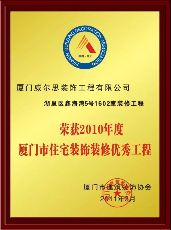 2010年威爾思裝飾為了讓工程質(zhì)量更有保障,在原有的企業(yè)框架基礎(chǔ)上,增加質(zhì)檢部,直接向客戶負(fù)責(zé),加大工程監(jiān)督力度。同年,在參評(píng)的100多個(gè)項(xiàng)目中脫穎而出,被授予“2010年度廈門市住宅裝飾裝修優(yōu)秀工程”;