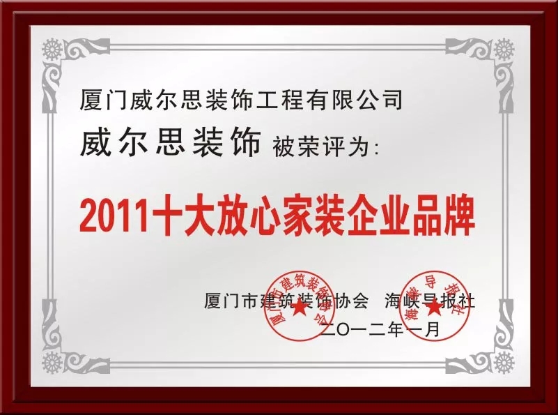 威爾思裝飾在眾多企業(yè)中脫穎而出,榮獲此次“廈門十大放心家裝企業(yè)”,這已是威爾思裝飾連續(xù)十一次獲得此殊榮。
