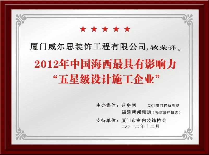2012年榮獲“海西家裝品牌企業(yè)”、海西最具影響力“五星級(jí)設(shè)計(jì)施工企業(yè)”、“2012年度誠(chéng)信裝飾公司”、“十大放心家裝企業(yè)”“十大家裝品牌企業(yè)”;